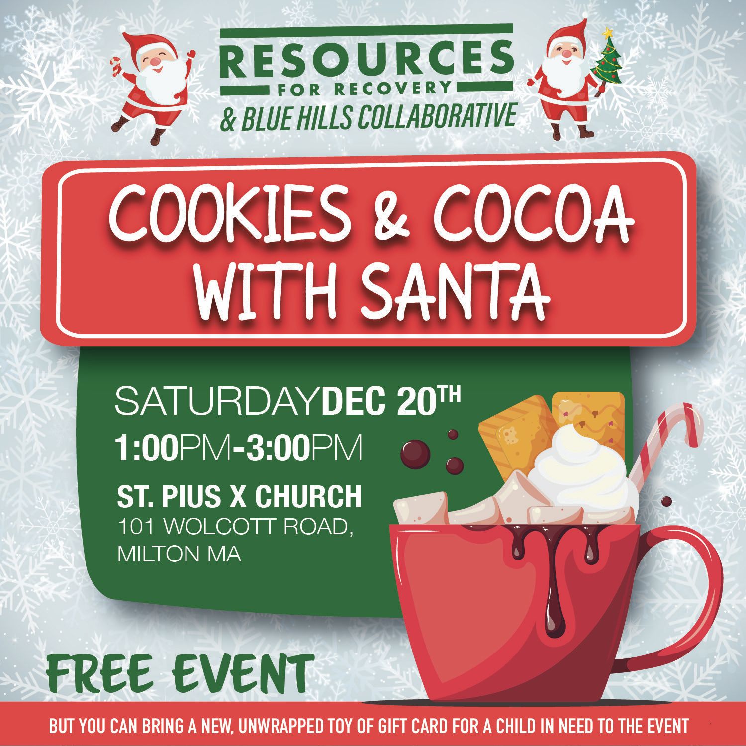 Join us for a fun and free event hosted by our friends at Resources for Recovery! Cookies and Cocoa with Santa will take place on Saturday, December 20 from 1-3 PM at St. Pius X. Kids will enjoy cookie decorating, hot chocolate and can take pictures with Santa before Christmas!